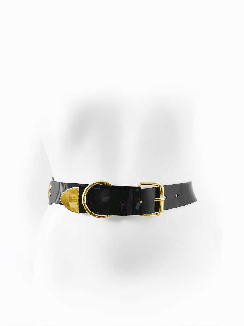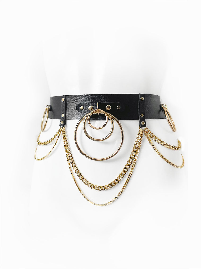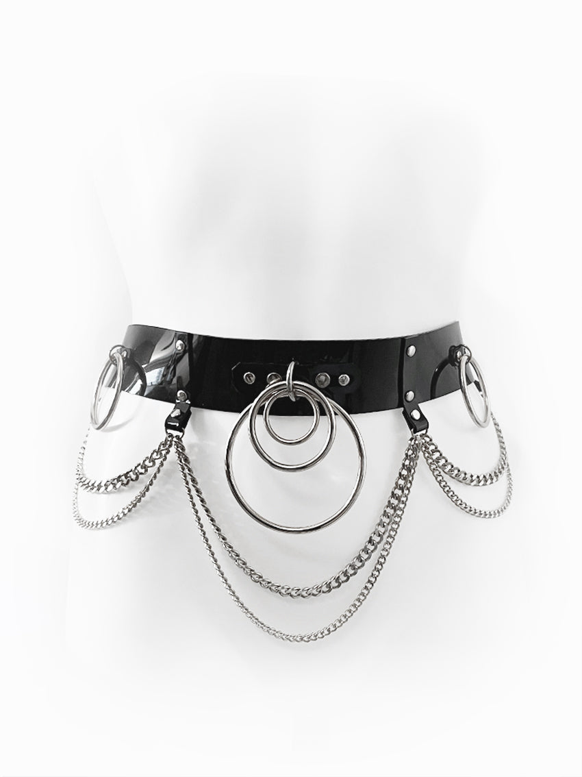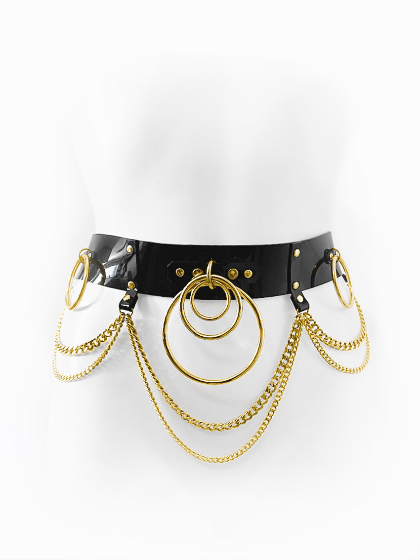 Watch out, THALASSA attracts attention. Two chains of different widths fall in waves over the hips and five O-rings are emblazoned on the front and sides of the PVC band. The front part is 40 mm wide, the back part 30 mm.