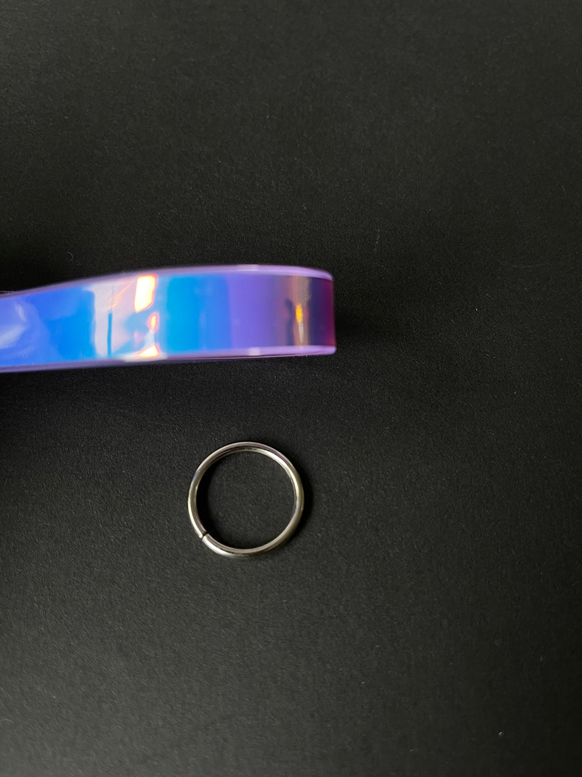 Collar THEMIS ist ein auffälliges Halsband aus Kunstleder oder Holo-PVC mit einem großen, kegelförmigen Halbedelstein-Anhänger und zwei Ringen an Karabinerhaken.